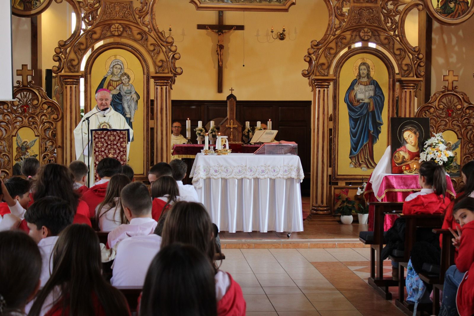 Durante l’omelia, ispirata dal testo biblico (Gv 2,1-11), Monsignor Aurel Percă ha incoraggiato gli alunni e i loro insegnanti ad avere lo stesso atteggiamento della Madre di Dio, che alle nozze di Cana, ha detto queste parole agli invitati alle nozze: Fatte tutto quello che vi dirà (Gesù).