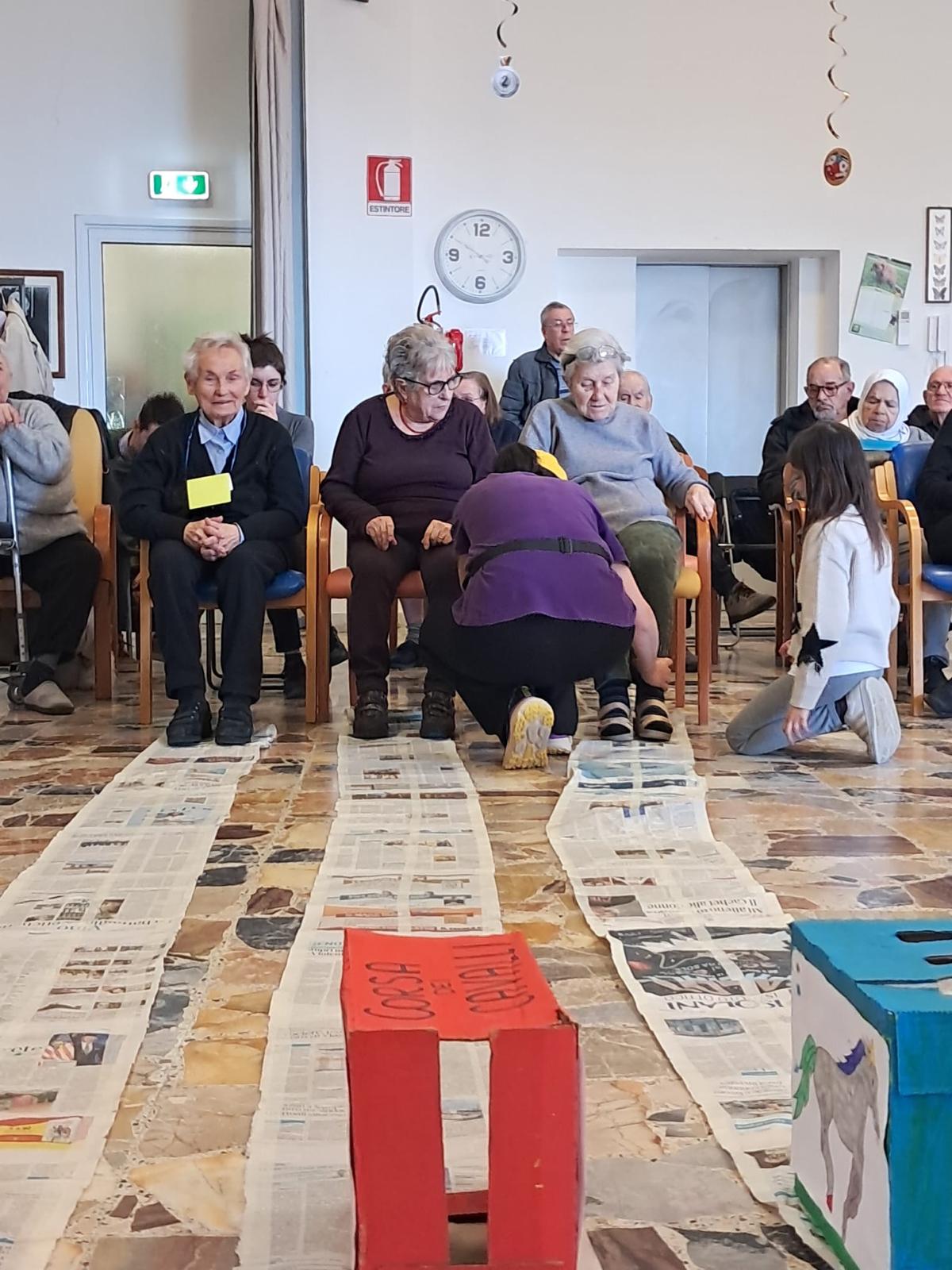Molteplici i giochi, declinati in modo simpatico e spiritoso: così la corsa podistica si è trasformata in un percorso per una bottiglia trainata da un filo da avvolgere, mentre quella ippica è stata costruita con scatole mosse attraverso un nastro di giornale animato da una corsa su sedia. Il “chappamusche” ha simulato un incontro di tennis mentre l’hockey si è svolto da seduti con bastoni di gommapiuma. Sicuramente il gioco più entusiasmante è stata la “caccia al coniglio”: con un martello di gomma morbida occorreva centrare un peluches che spuntava da buchi diversi su una tavola posizionata al centro.